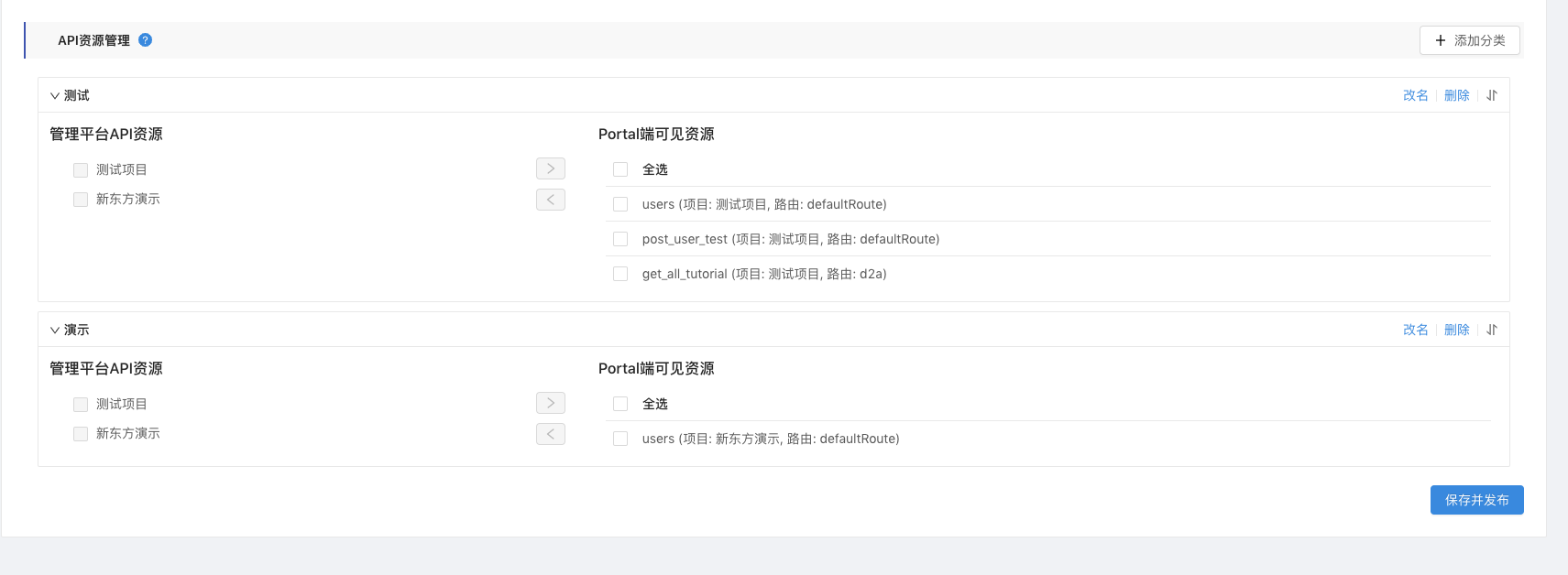 在API资源中可以看到一个叫做**分组**的概念,方便在门户中按照业务逻辑对API资源进行分组。您可以创建、删除、更名以及改变该分组的顺序;通过将API资源放入到不同的分组中,门户保存后,门户上的API资源将会按照您所创建的分组形式展现出来。