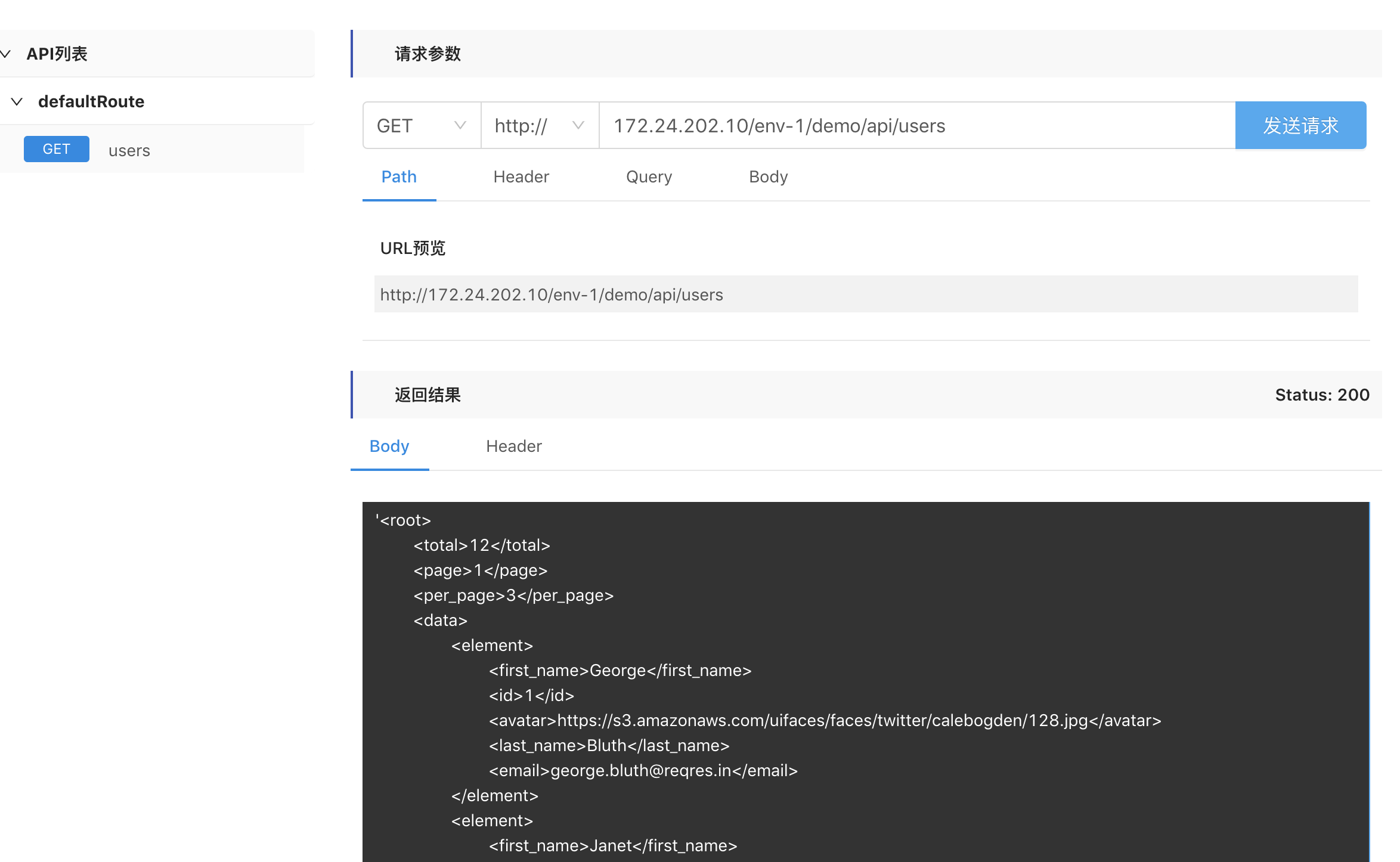 设置好之后,我们回到调试tab,再次点击发送请求结果按钮。此时,我们可以看到刚才接口的返回结果已经被转换成XML格式