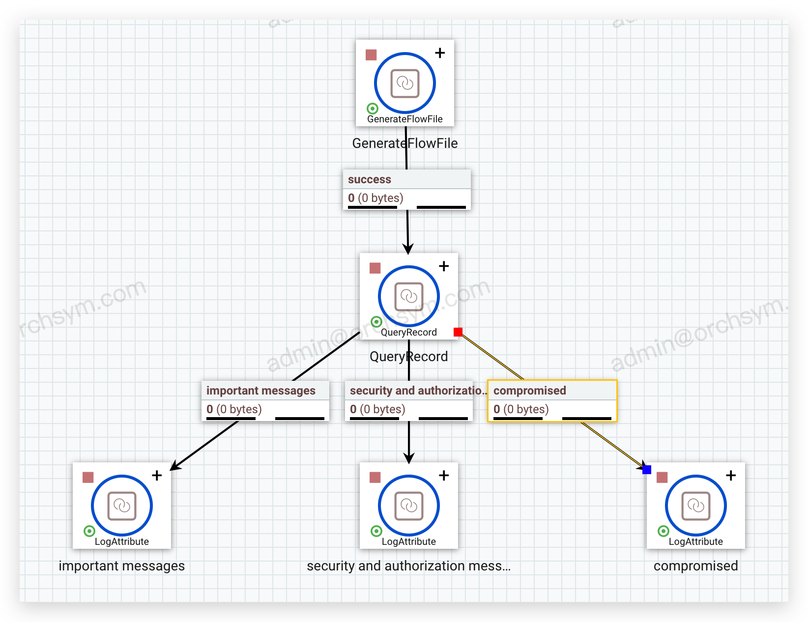 也可以注册多个 SQL SELECT 语句,对每个结果集都分出一个独立的流文件。例如,如果我们有另一个应用场景,比如在同样的 Syslog 数据中,我们想要将安全/授权信息(facility 值为4)相关的日志记录推送到 Kafka;可以使用一个 QueryRecord 组件同时完成上面的这些查询,然后根据使用场景处理每个流文件。如果数据有新的应用场景出现,只需要添加另一个查询来分离出新的流文件: