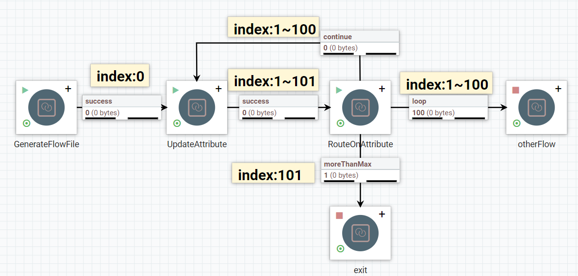 - 配置一个变量 retryTimes变量,初始化为 0 。如果不具备动态增加属性的情况,可以在重试组件的前面增加updateAttribute组件,在它上面增加属性。