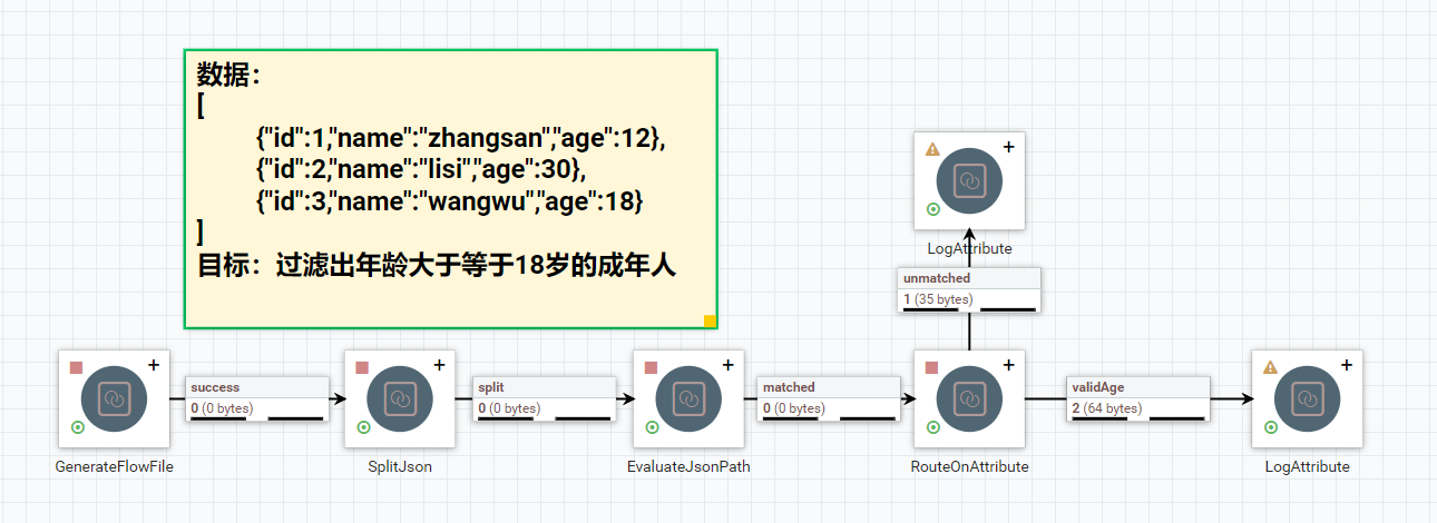 - 动态增加带路由条件的输出流 validAge = ${age:ge(18)},表示如果age大于等于18,则会流向validAge的flow,否则会流向unmatched的flow。