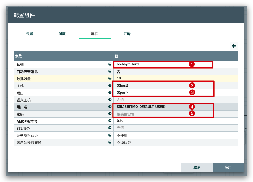 - 默认需要配置 host、port、queue 和 用户认证相关信息